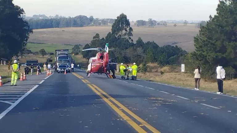 Um acidente entre um carro e uma motocicleta no trevo de acesso à Colônina Witmarsum, em Palmeira, nos Campos Gerais do Paraná,