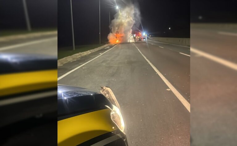Um caminhão-tanque carregado com etanol pegou fogo no quilômetro 35 da BR-277, em Morretes, no litoral do Paraná, na noite de terça-feira