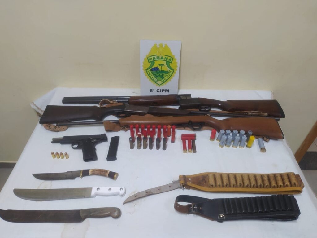 Em revista ao veículo, foi localizado no seu interior, quatro armas de fogo, sendo uma Espingarda Calibre .12 Boito, uma Espingarda Calibre .28, uma Espingarda Calibre .22 modelo 7022 CBC e uma pistola, cal. .45mm, com um carregador com 4 munições intactas, além de dois cintos cartucheiros, dois facões e uma faca.