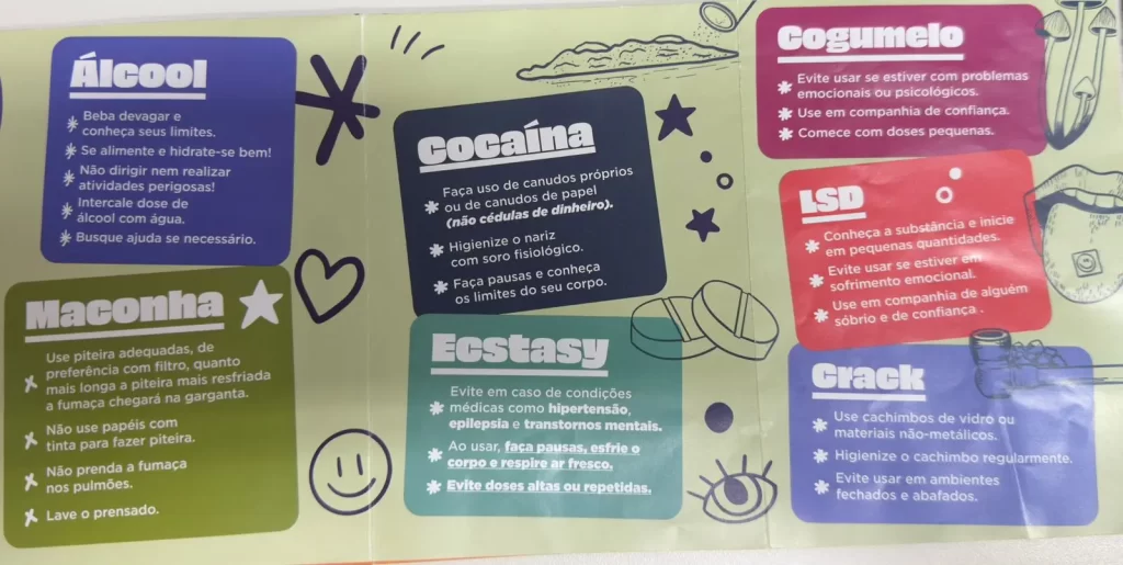 O panfleto distribuído apresenta, entre outras coisas, instruções de redução de danos como o uso de piteiras para fumar maconha, canudos apropriados para evitar contaminações no consumo de cocaína e orientação sobre dosagem mínima no uso de LSD. Esse tipo de material, segundo o mandato da Professora Angela, é utilizado em políticas públicas de saúde em diversas cidades brasileiras e segue recomendações da Organização Mundial da Saúde (OMS), com foco na prevenção de infecções, overdoses e outros riscos associados ao consumo.