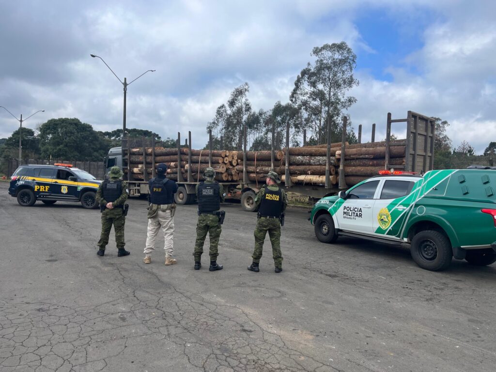 Os policiais deram ordem de parada para o condutor de uma combinação de veículos de carga, transportando toras de Araucaria angustifoli, espécie protegida por legislação ambiental.