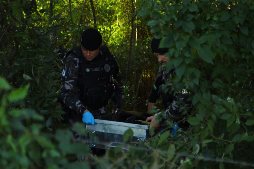 Ainda em fuga, o homem cruzou com outra viatura da PM, que iniciou novo acompanhamento pelas imediações da estrada Pedro Wosgrau. Após colidir o Fiesta e abandoná-lo, o suspeito entrou em uma área de mata, disparando contra os policiais durante a tentativa de fuga a pé.